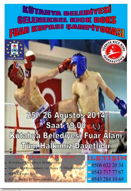 Kütahya Belediye Başkanlığı, Kütahya Gençlik Hizmetleri ve Spor İl Müdürlüğü, Kick Boks Kütahya İl Temsilciliği ve Rem Fuarcılık ortak organizasyonuyla gerçekleştirilen Kütahya Belediyesi Geleneksel Kick Boks Fuar Kupası Şampiyonası 25-26 Ağustos tarihlerinde yapılacak.