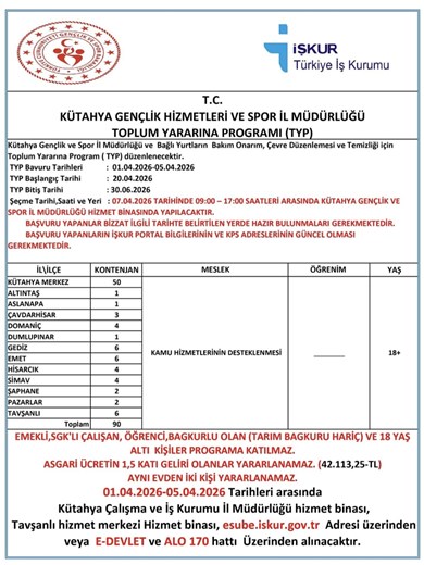 Kütahya Gençlik ve Spor İl Müdürlüğümüz ve bağlı resmi kurumlarda uygulanacak Toplum Yararına Program (TYP) kapsamında katılımcı alımı gerçekleştirilecektir.